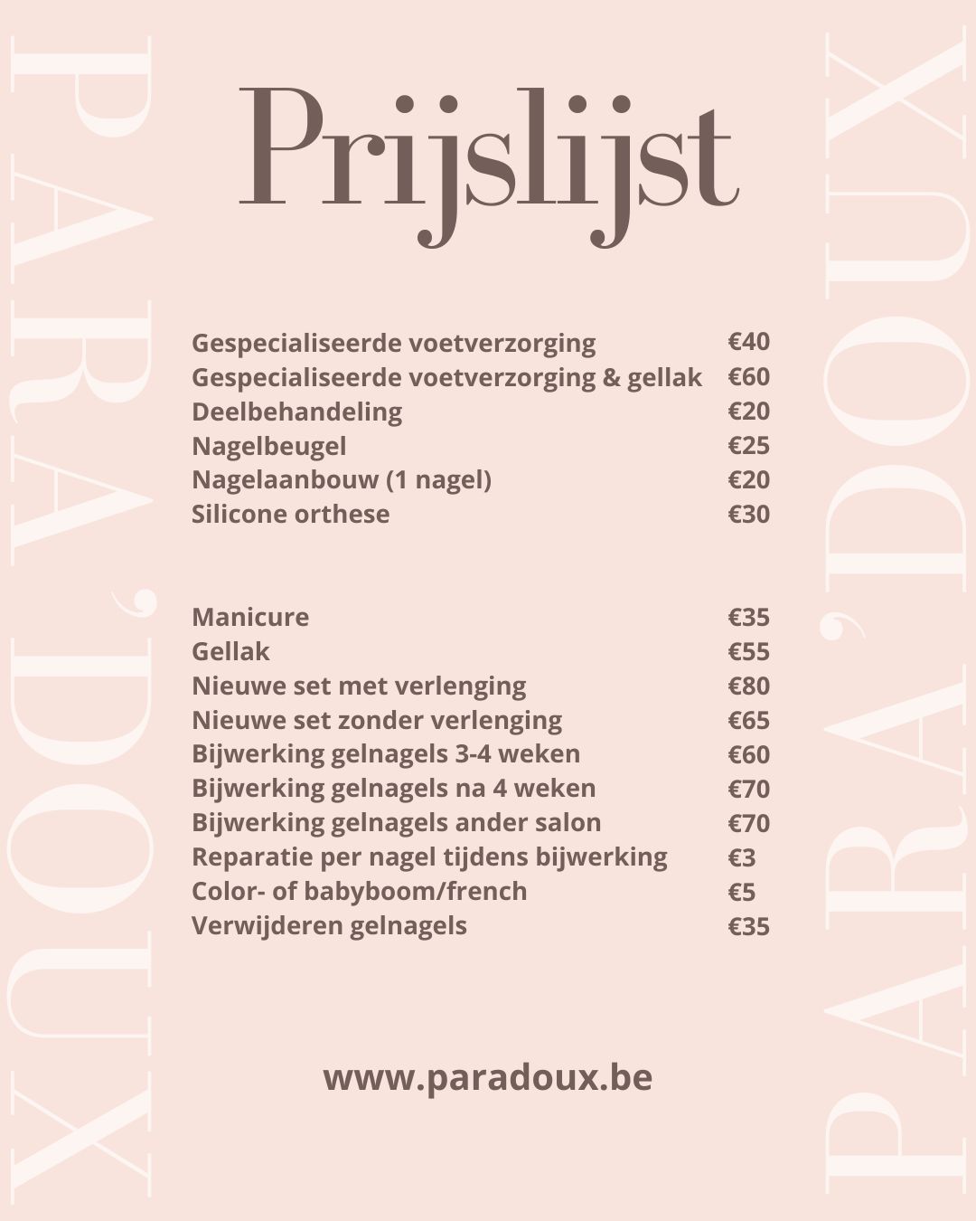 Een volledige verzorging van de voeten waarbij huid- en nagelaandoeningen zorgvuldig en professioneel worden behandeld. Mogelijke aandoeningen zijn onder andere eelt, kloven, likdoorns, schimmelnagels en ingegroeide teennagels. De behandeling is gericht op het verlichten van bestaande klachten én het voorkomen van verdere problemen. Tijdens de behandeling ontvang je persoonlijk advies, volledig afgestemd op de noden van jouw voeten. Daarna worden de nagels gelakt met een gellak naar keuze die tot wel 8 weken mooi blijft zitten.